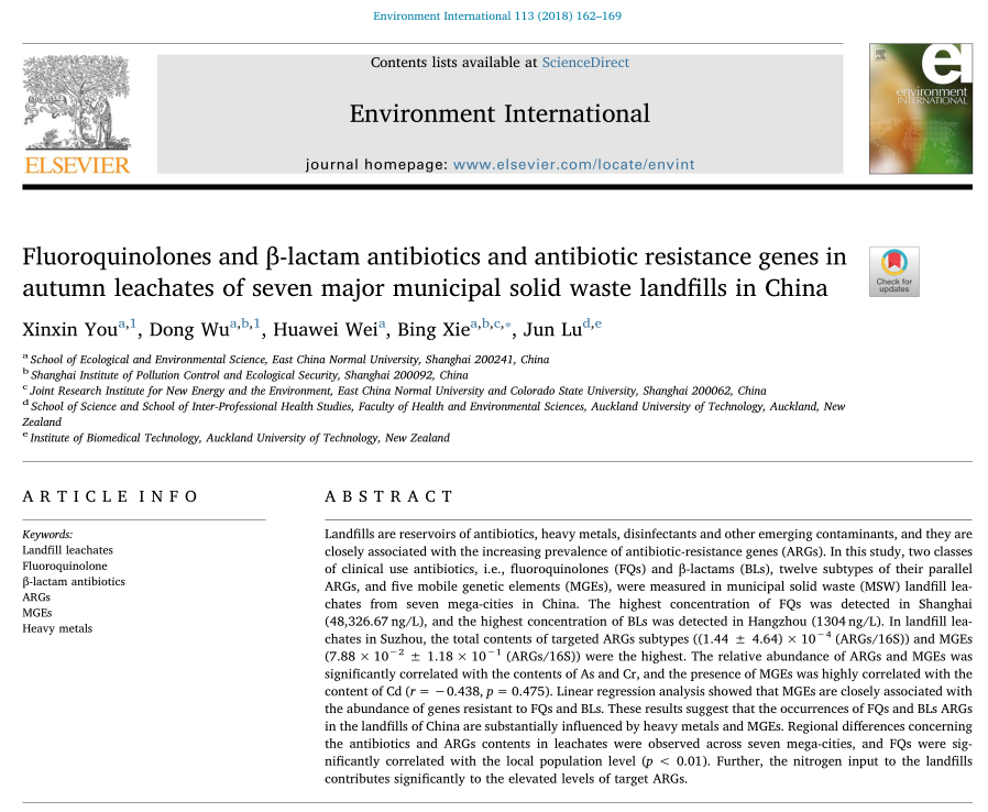 华东师范大学谢冰教授在Environment International发表文章:Fluoroquinolones and β-lactam antibiotics and antibiotic resistance genes in autumn leachates of seven major municipal solid waste landfills in China