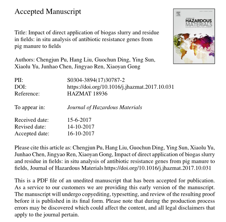 中国农业大学孙英教授在Hazardous Materialsional发表文章:: Impact of direct application of biogas slurry and residue in fields: in situ analysis of antibiotic resistance genes from pig manure to fields