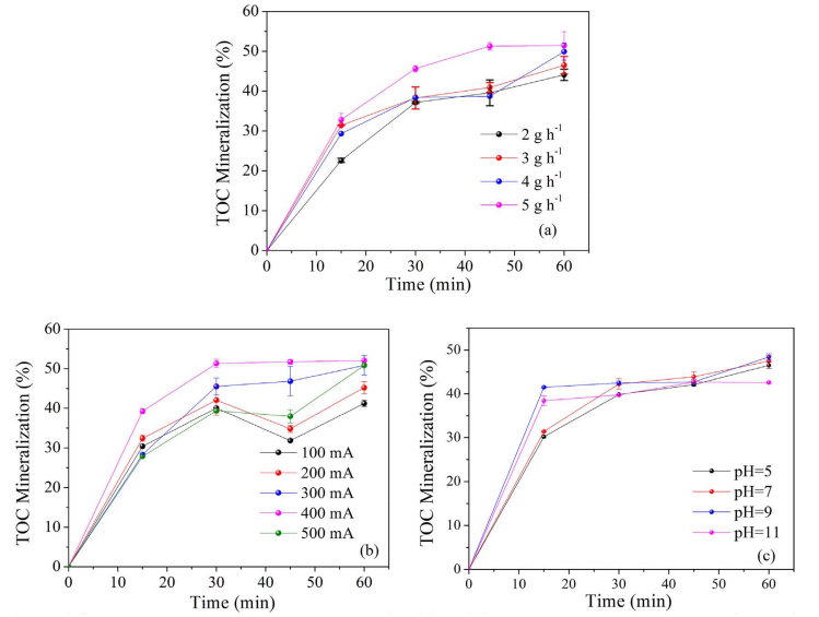 图2. E-peroxone预处理过程中O3浓度(a),电流(b),pH(c)对TOC矿化的影响。