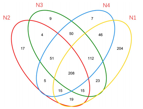 图4. 维恩图显示了基于OTUs的4个处理样本在3%不同程度上的重叠。