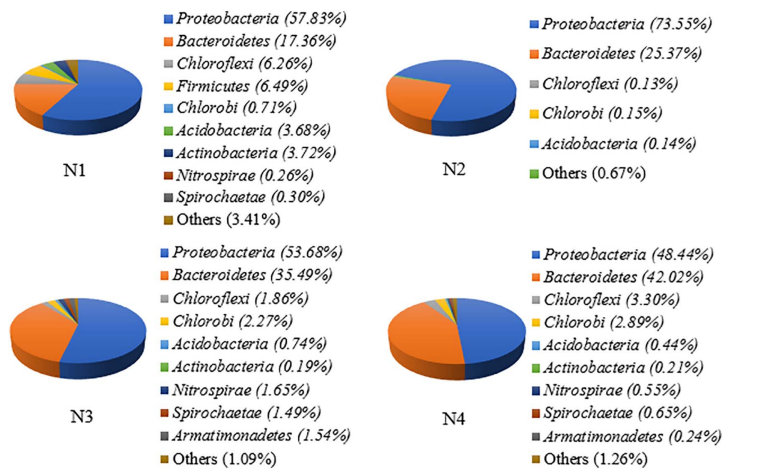 表1中观察到的OTU,Ace和Chao1估计值表明样本N2具有最低的丰度。样品N3和N4表明,E-peroxone预处理显着恢复微生物的丰富度和多样性,这对生物废水处理系统稳定性有一定影响。