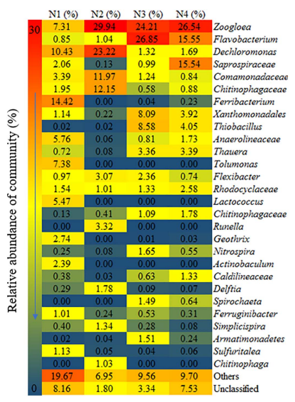 样品N1,N2,N3和N4中的每个分类属的特定丰度也在图6中提供和比较。属于Ferribacterium,Anaerolineaceae,Tolumonas,Lactococcus,Geothrix和Actinobaculum对CIP极其敏感,它们的相对 CIP刺激下丰度大幅下降。 相反,Zoogloea,Dechloromonas,Comamonadaceae和Chitinophagaceae的丰度显着增加,表明它们对抗生素CIP具有强抗性。 这一发现表明,残留在废水中的抗生素残留物通过调整微生物种群结构并同时抑制其微生物活性对其处理效率具有显着影响。