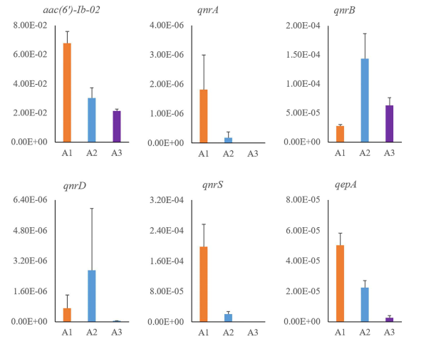 图8.质粒介导的喹诺酮类耐药(PMQR)基因在E-peroxone联合SBR样品中的相对丰度(ARGs / 16S rRNA)。A1:单独的SBR中没有进行E-peroxone预处理;A2:SBR中具有E-peroxone预处理30分钟;A3:SBR中E-peroxone预处理75分钟。