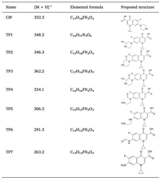 表2.CIP和检测到通过E-peroxone处理去除CIP的转化产物(TP)