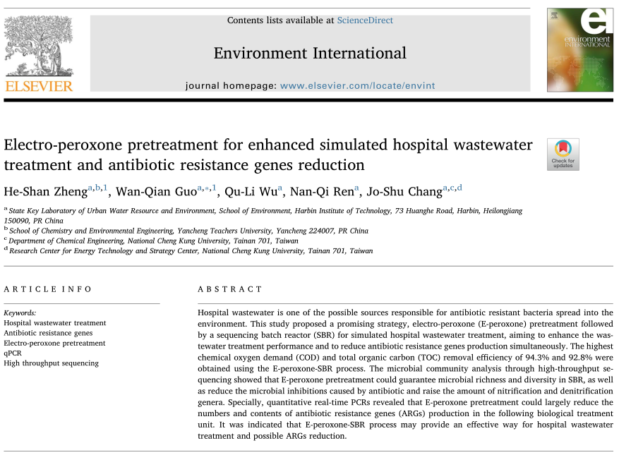 哈尔滨工业大学 郑博士在Environment International发表文章:: Electro-peroxone pretreatment for enhanced simulated hospital wastewater treatment and antibiotic resistance genes reduction